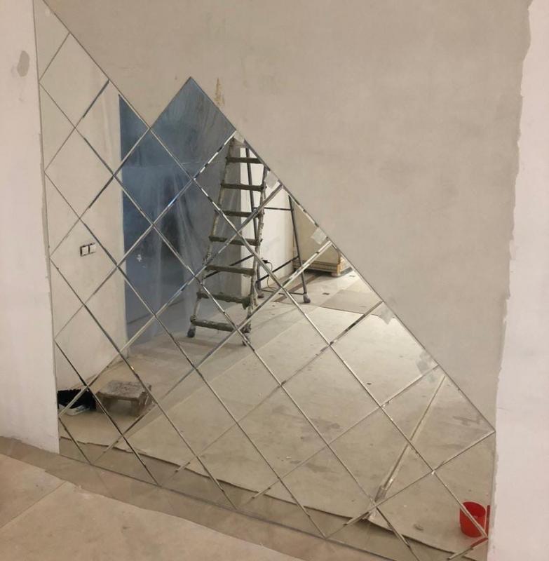 На фотографии видно, как наши мастера монтирую на стену панно из квадратной зеркальной плитки. Если чуть присмотреться, то можно увидеть, что плитка не просто нарезана квадратами, но по краям она чуть усечена – сделан фацет. Это нужно для безопасности, а также для красоты, поскольку фацетный край добавляет в общую картину световые блики.
